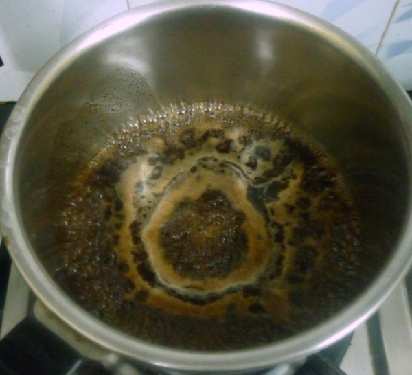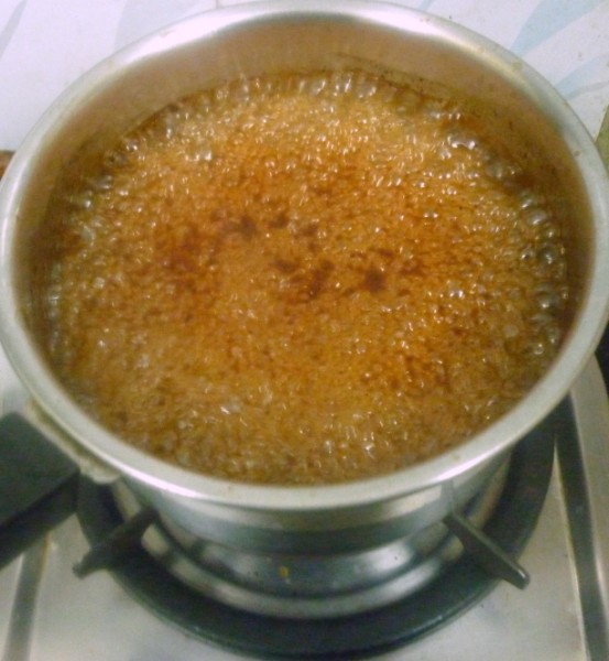 When the liquid is quite thick, add the red chili powder. It will start to boil over.