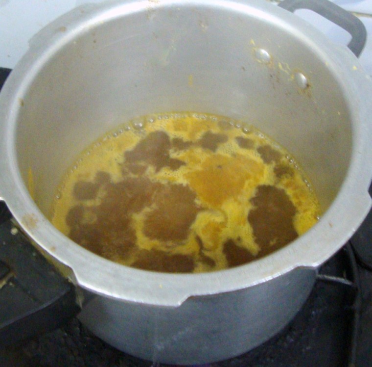 Once done, add the cooked tur dal and bring to a rolling boil again. Add more water at this stage if required.