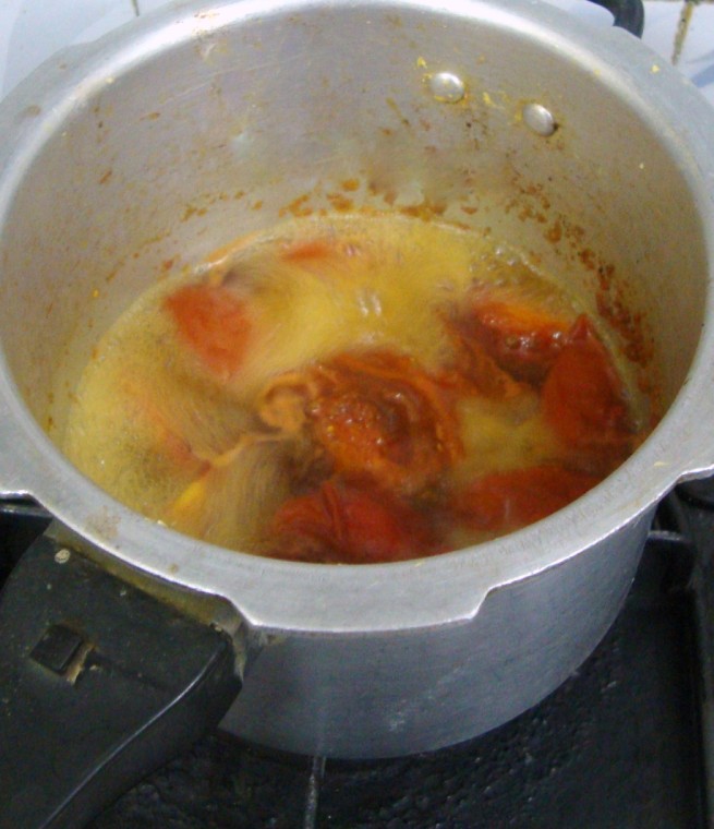 Then add tomatoes, which are cut in 8 pieces or more, depending on the size. Continue to simmer on medium heat until cooked.