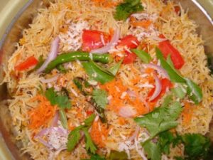Then it happened one morning, I saw her busy making something. She said she will prepare breakfast. And what landed on the dining table was looking so colourful that I was excited to know what it is. She said she just made it different. So it was my job to come up with a name. Since it was more of a chat looking, I christened it Semiya Chat. Hope you like it.