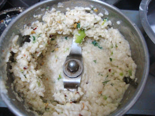 Soak Urad dal for 2 hrs Drain and grind along with green chilies, red chilies, salt, hing, curry leaves to a coarse mix