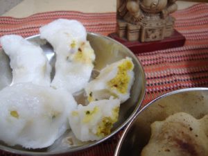 This is a savory dish made with the rice flour dough stuffed with a savory mix of Urad dal ground with green and red chilies. After all the sweet modak / Kozhukattai offered to God, I am sure he needs a savory one to make a pleasant combination.