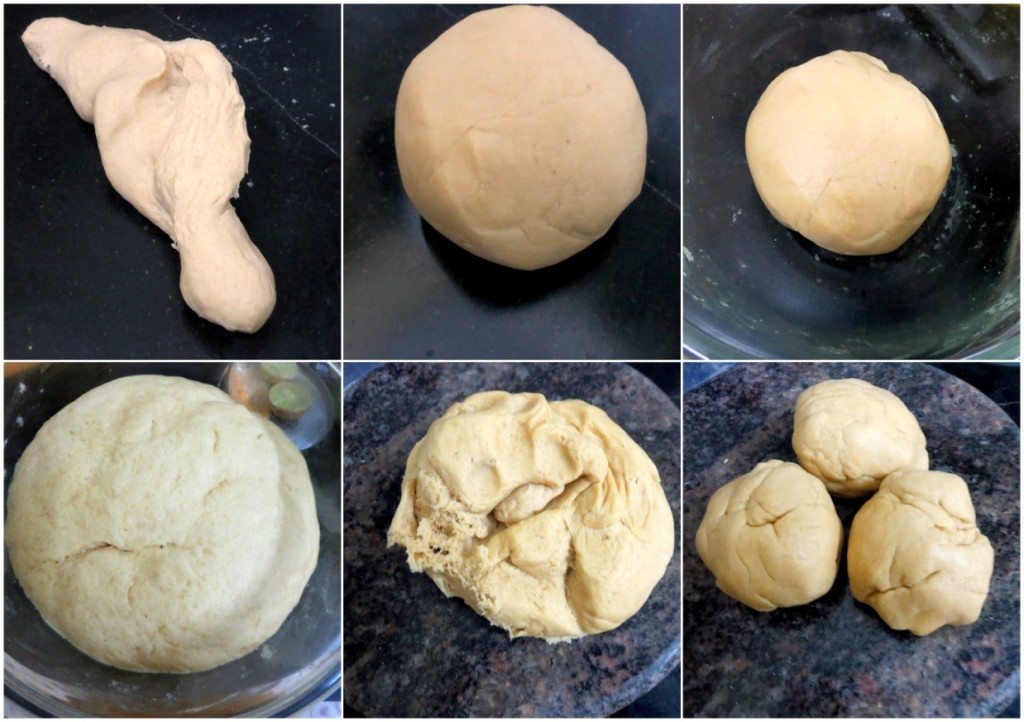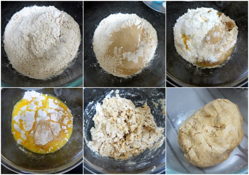 In a wide bowl, take the flours, yeast, sugar, and salt. Slowly add water to knead to a soft pliable dough. Transfer to your counter and knead again for 10 mins. Keep it covered in an oiled bowl until it doubles.